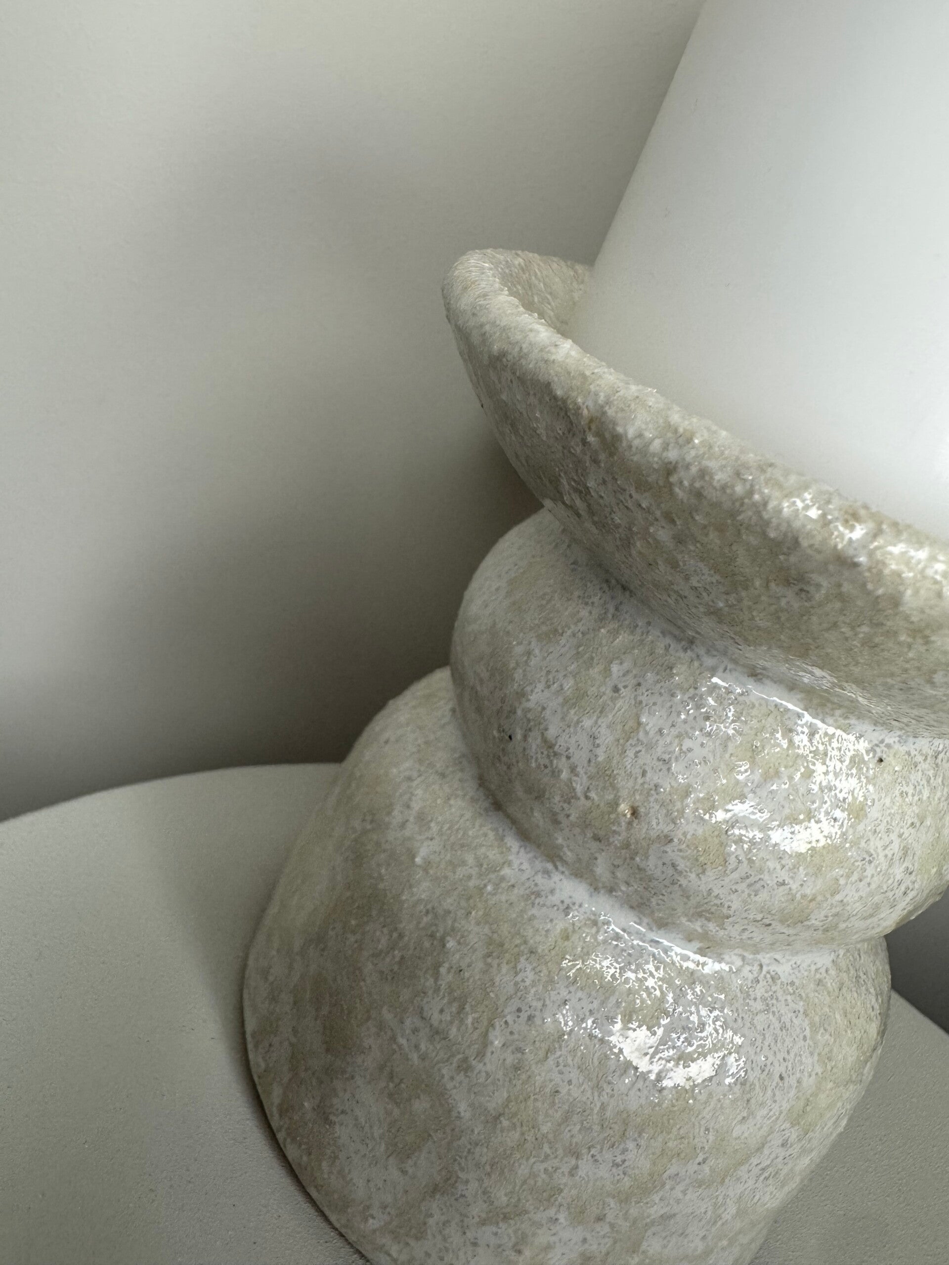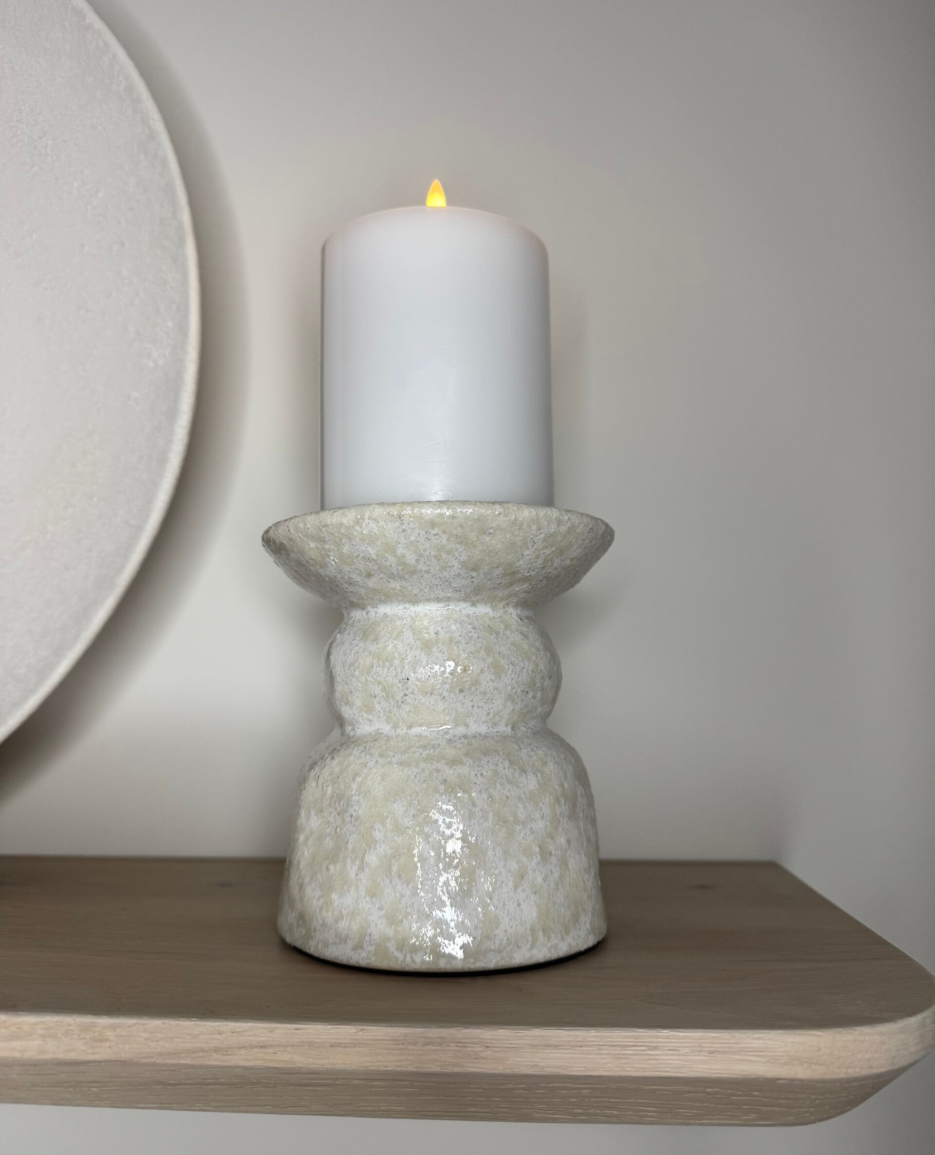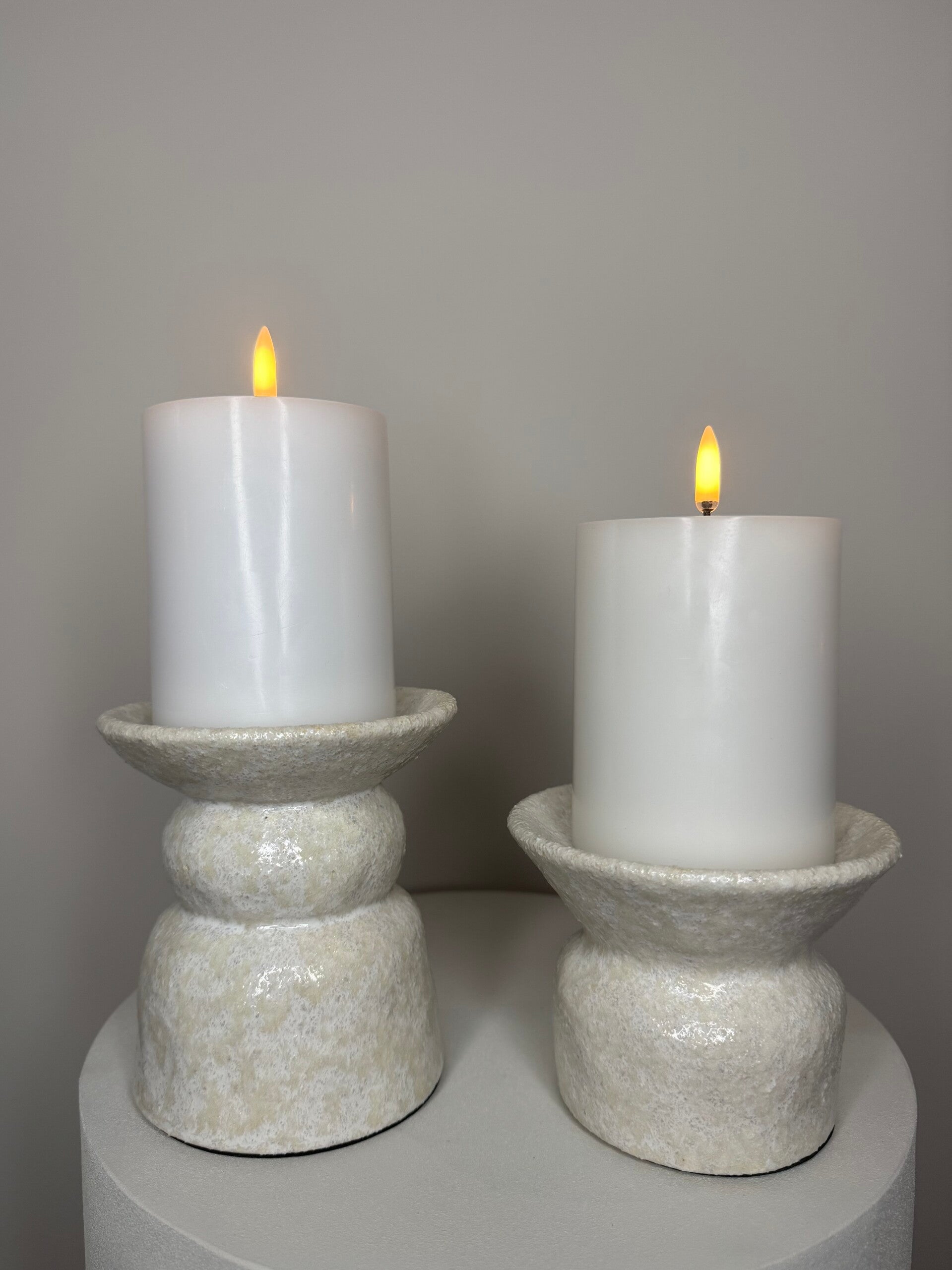 Deze set van twee cremekleurige kandelaars brengt direct een huiselijke sfeer in je interieur. De organische vormen en natuurlijke tint, versterkt door een subtiel glansje, zorgen voor een stijlvolle uitstraling. Samen vormen ze een sfeervol duo.
